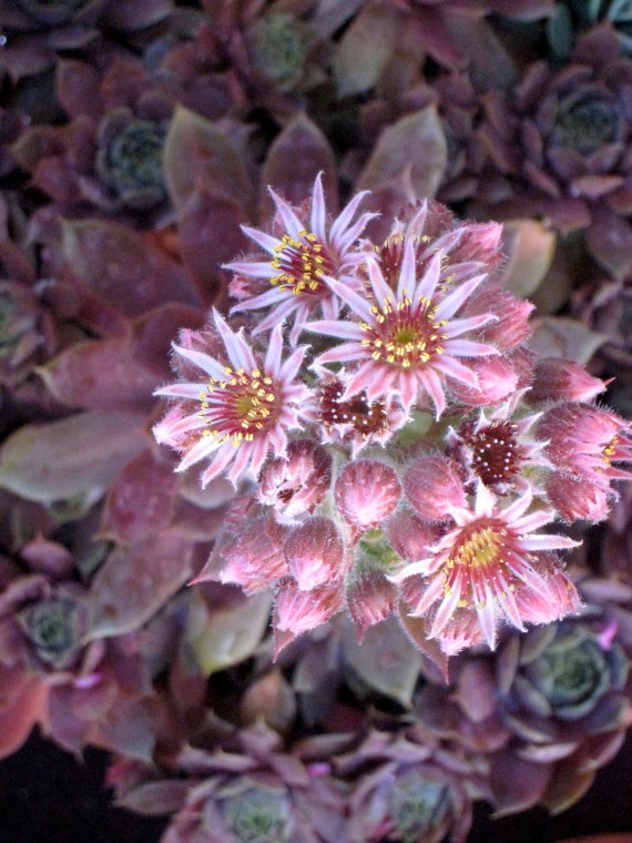 I didn’t know why these plants were also called Houseleeks until I read Out Life in Gardens: “houseleek was also a pun, since the most decayed roofs of houses both supported the plants best and could be presumed to leak.” Leek, leak, get it?