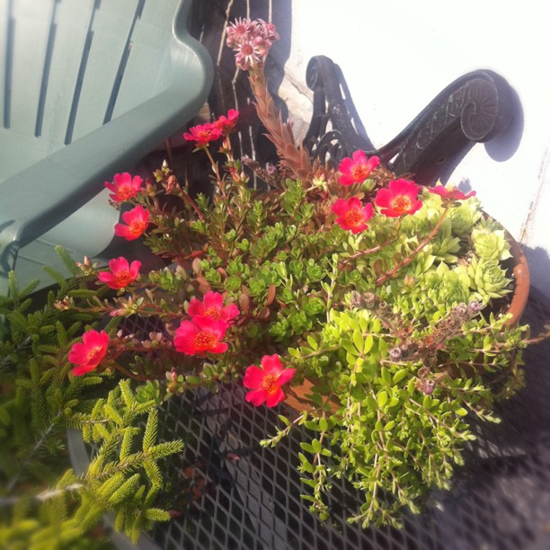 Last summer, my succulents sucked. This year I am having more luck. I figured out I could use portulaca, a faster growing annual, to fill in around my sempervivums (Hard-core gardening types call them “semps.”) The portulaca flowers add color too, but the flowers are only open during the day, so we don’t get to see them too often.