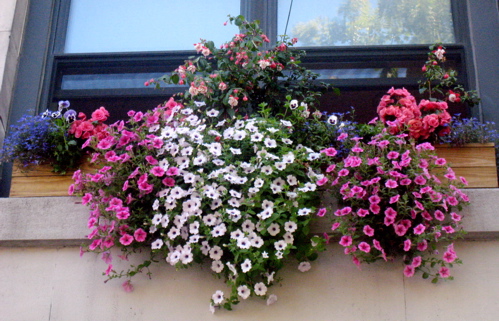 They serve a drink here called the Granny Polite – white port mixed with fresh lemon and tonic. Pelargonium and begonias, usually thought of as polite granny plants, are mixed up with mint and thyme for a fresh look. Skinny silvery rosemary leans out of the boxes, kind of like the hipster dudes walking past the sidewalk bar. (I haven’t seen a local Brooklyn source for Perlargonium geraniums; I might order some of these geraniums from Logee’s next year. Read more about scented geraniums on design*sponge.)